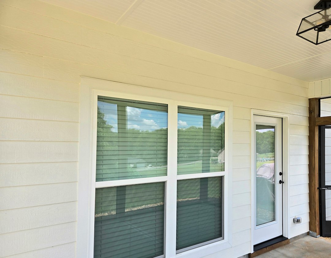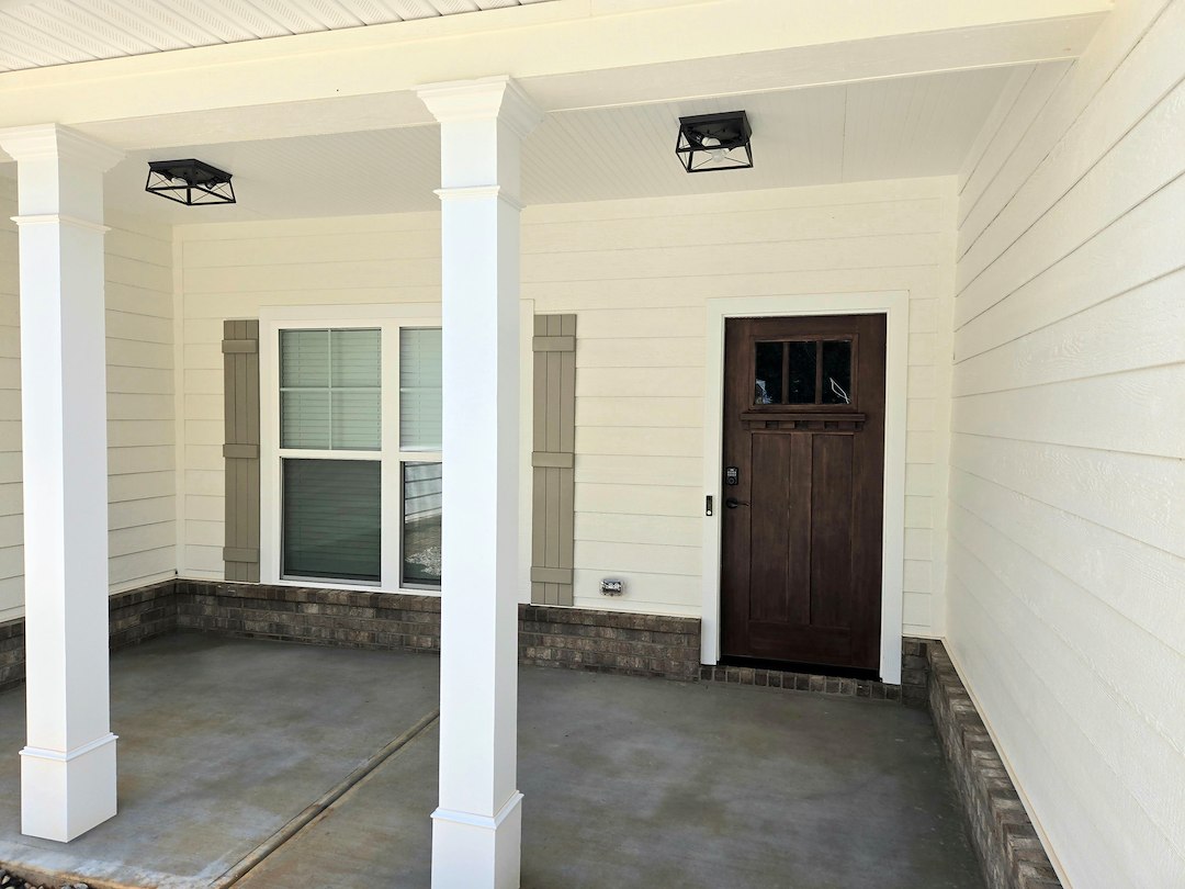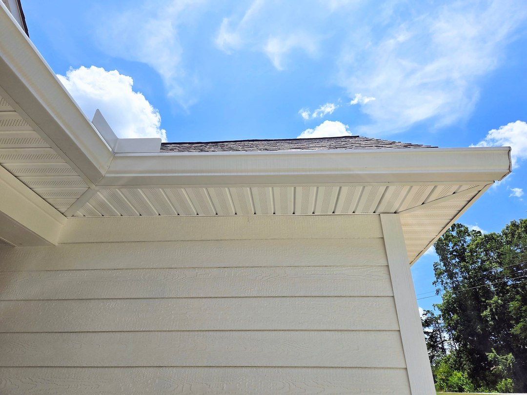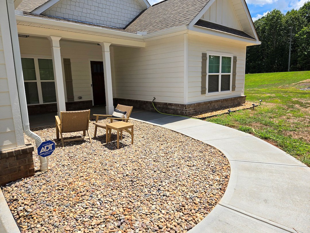 This home in Cleveland, GA, was built two years ago and has red clay stains at the bottom of the Hardy Plank due to rainwater splashing onto the siding. The gutters had "tiger streaks" caused by the asphalt from the shingles and airborne contaminants. There was also organic growth on the siding and cobwebs hanging from the eaves. Although the driveway appeared relatively clean, there were sections where organic growth had started to develop. The homeowners reached out for our exterior house washing services and driveway cleaning service to tackle these issues.