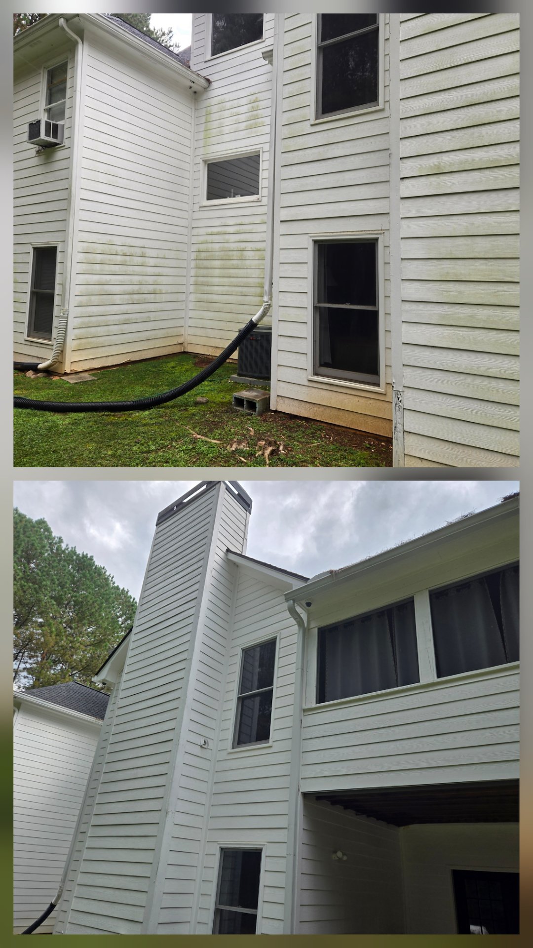 The algae and mold were eliminated using the soft washing method. This technique effectively kills and gently removes organic growth, significantly prolonging the cleanliness of the surfaces. The tiger striping on the gutters was removed using a specially formulated cleaner designed to eliminate these streaks. Even though the red clay stains were severe, most of them were successfully removed.
