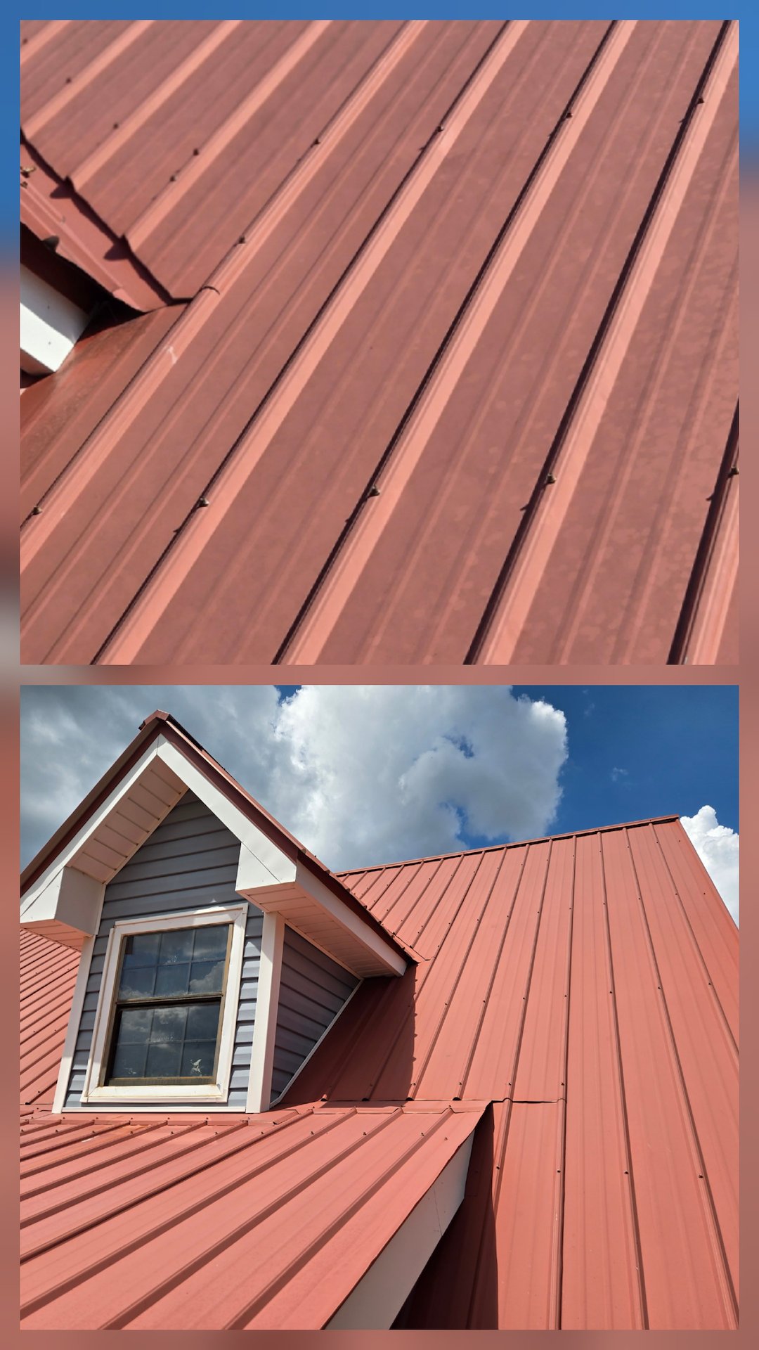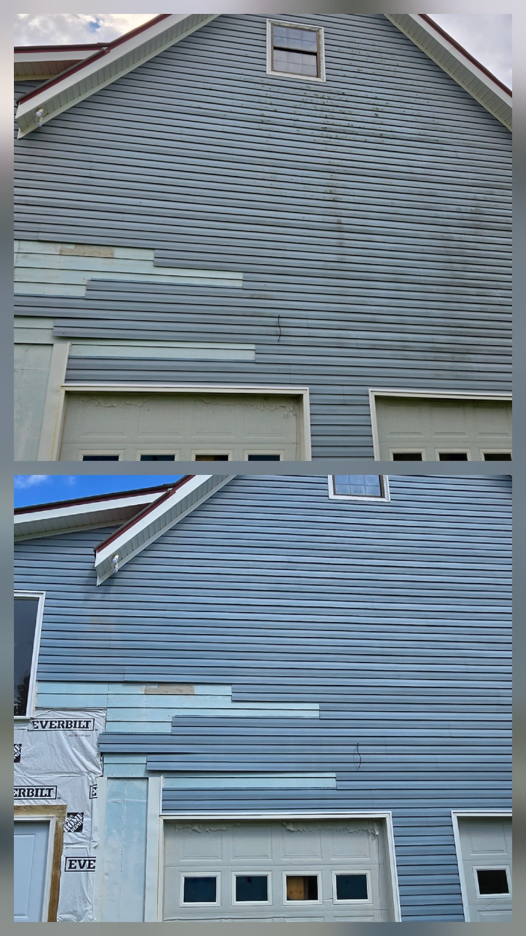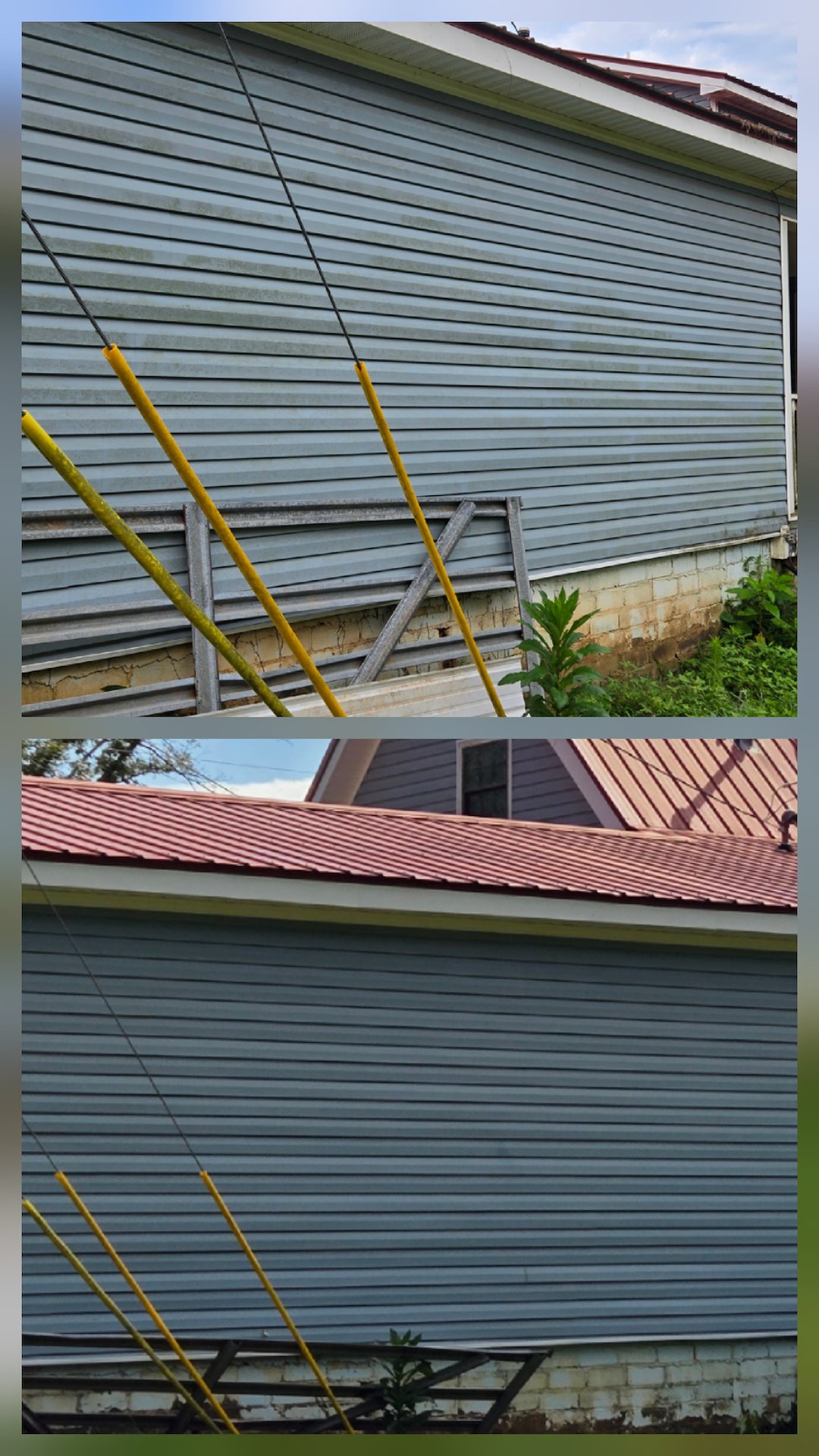 The metal roof was covered in algae, mold, and grime. Additionally, the siding had a thick layer of organic material and had oxidized to the extent that its color had severely faded. To tackle these challenges, we utilized specialized cleaning solutions and techniques designed for each surface. The metal roof was safely soft washed from a ladder to prevent any damage. As we worked diligently, the home began to reveal its original beauty, promising a vibrant new look once the remodel was complete.
