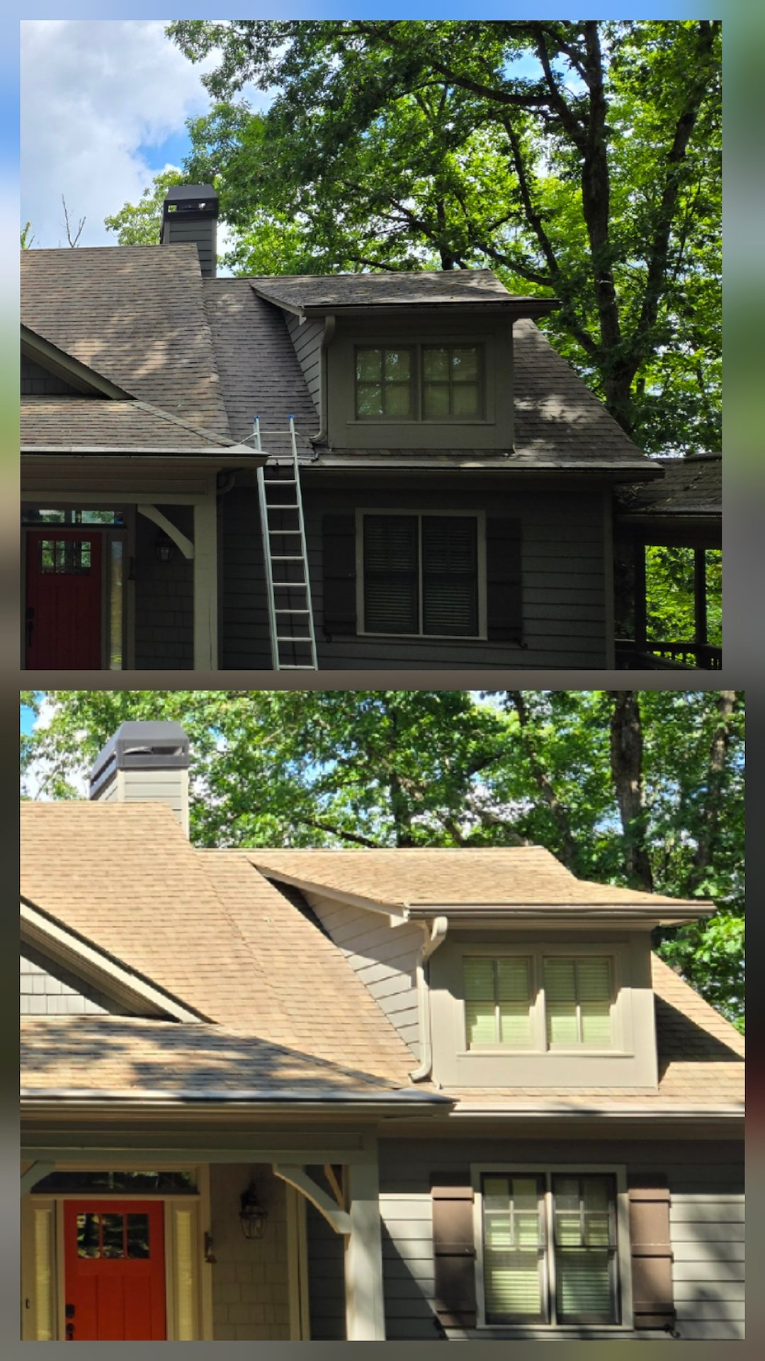 This mountain home, in Jasper, GA, was long overdue for a roof cleaning. Over the past 13 years, algae and moss had accumulated, creating an unsightly appearance and potentially damaging the shingles. The homeowners determined it was time to restore the home's original charm and safeguard it against potential damage. They requested our roof cleaning service and gutter exterior cleaning service.