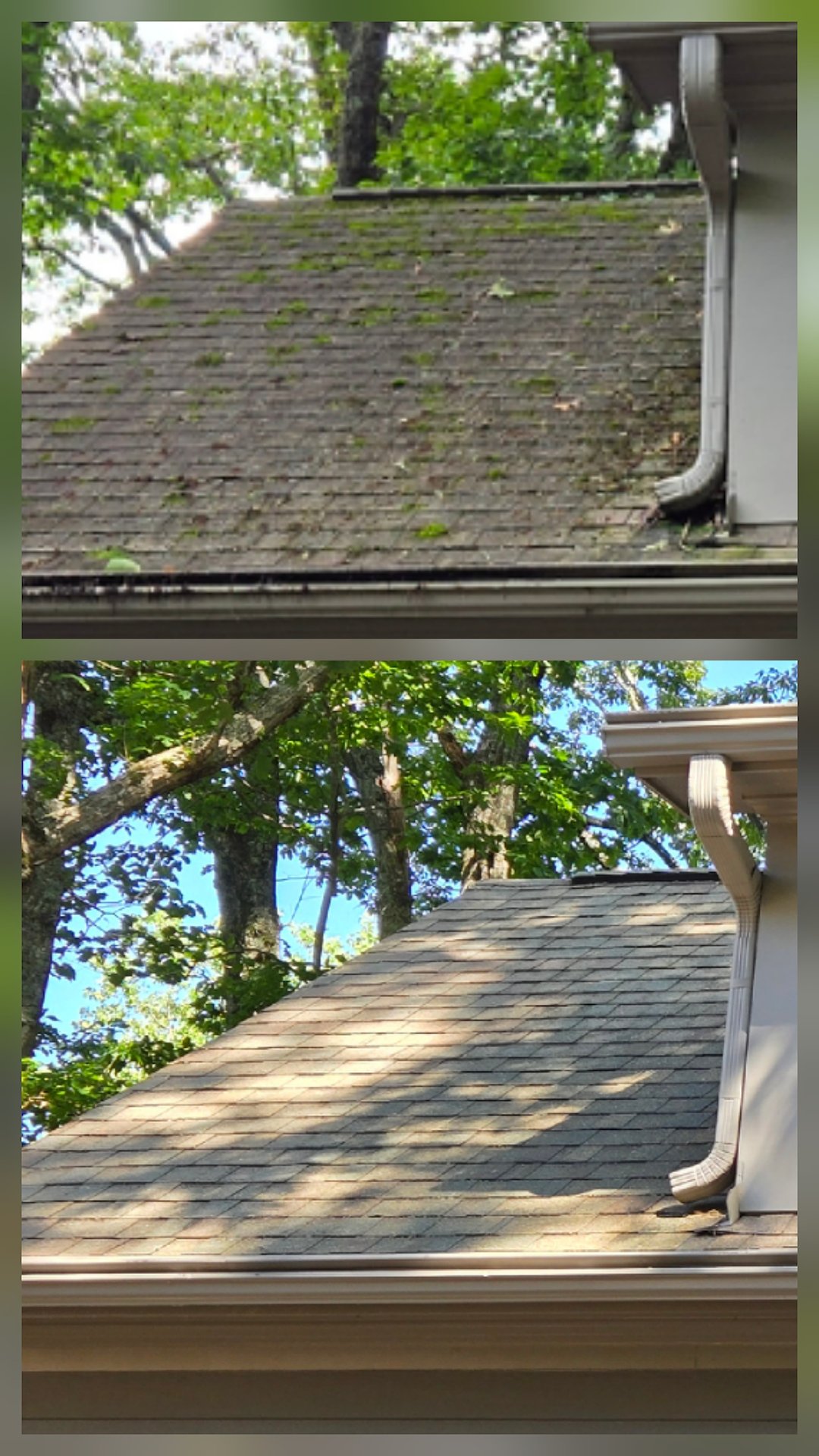 I used our specialized soft wash roof cleaning solution to clean the roofs on the home and garage. The sections with moss buildup were carefully rinsed away using low pressure. The vast majority of the moss was successfully removed. The remaining small bits were killed by the soft wash solution and would eventually be washed away by the rain.