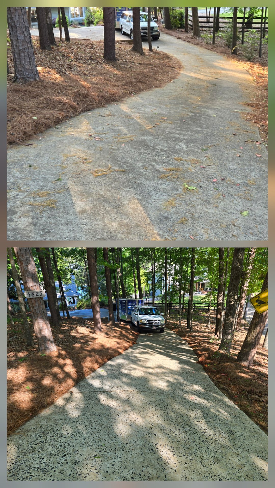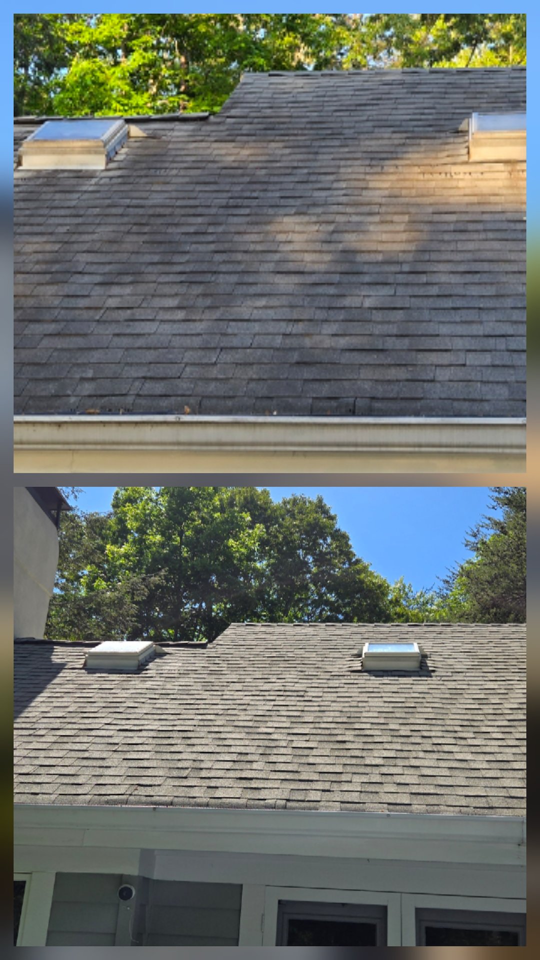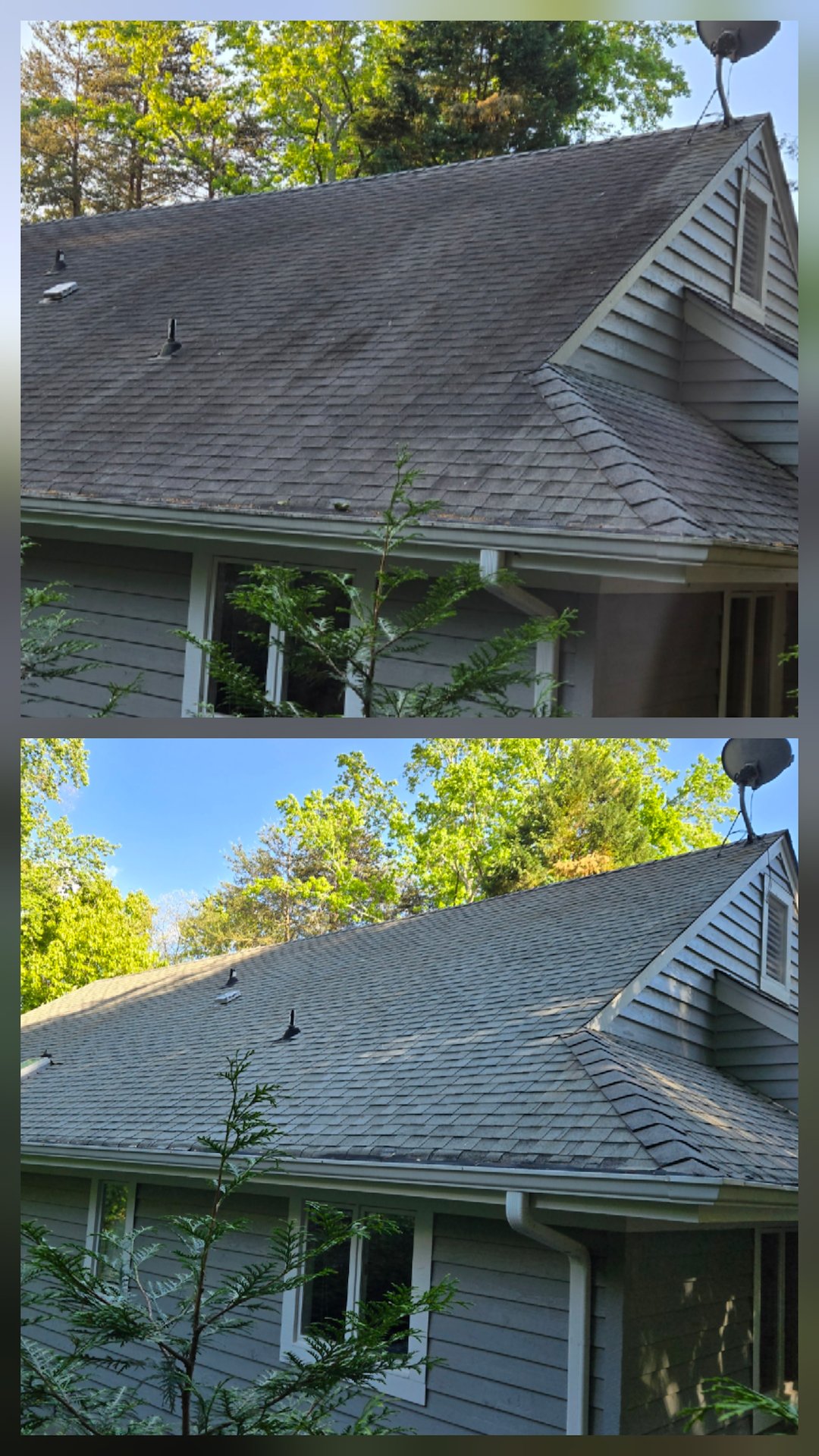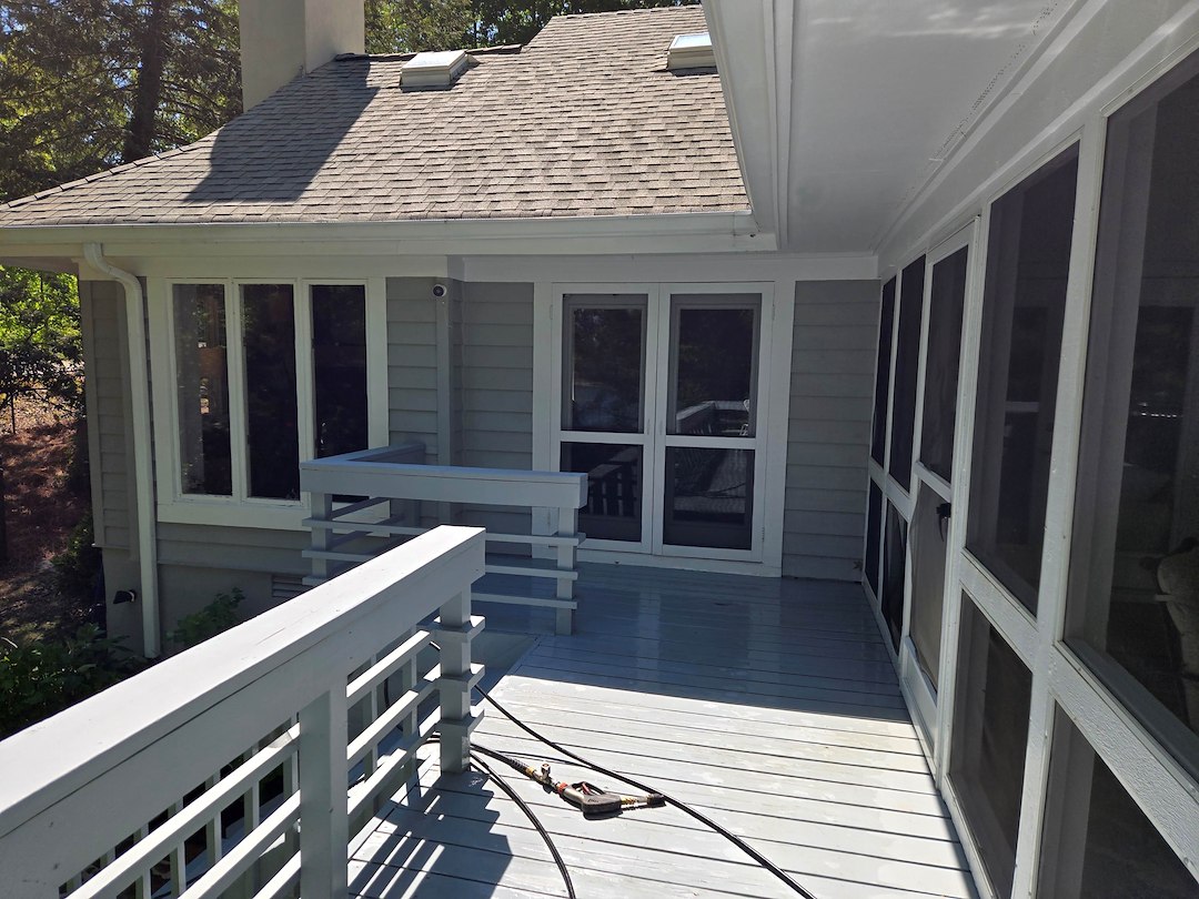 The roof, house, and decks were all soft-washed, and the driveway was pressure-washed. The Gloeocapsa magma was eliminated from the roof, which makes it look fantastic and extends the life of the shingles. Gloeocapsa magma feeds on the limestone, which serves as a filler in shingle manufacturing. This process results in the loss of granules that provide protection to the shingles.