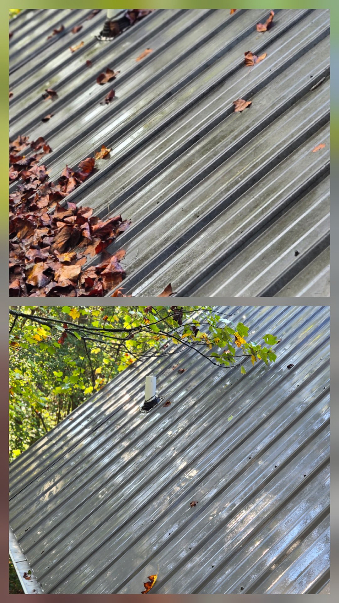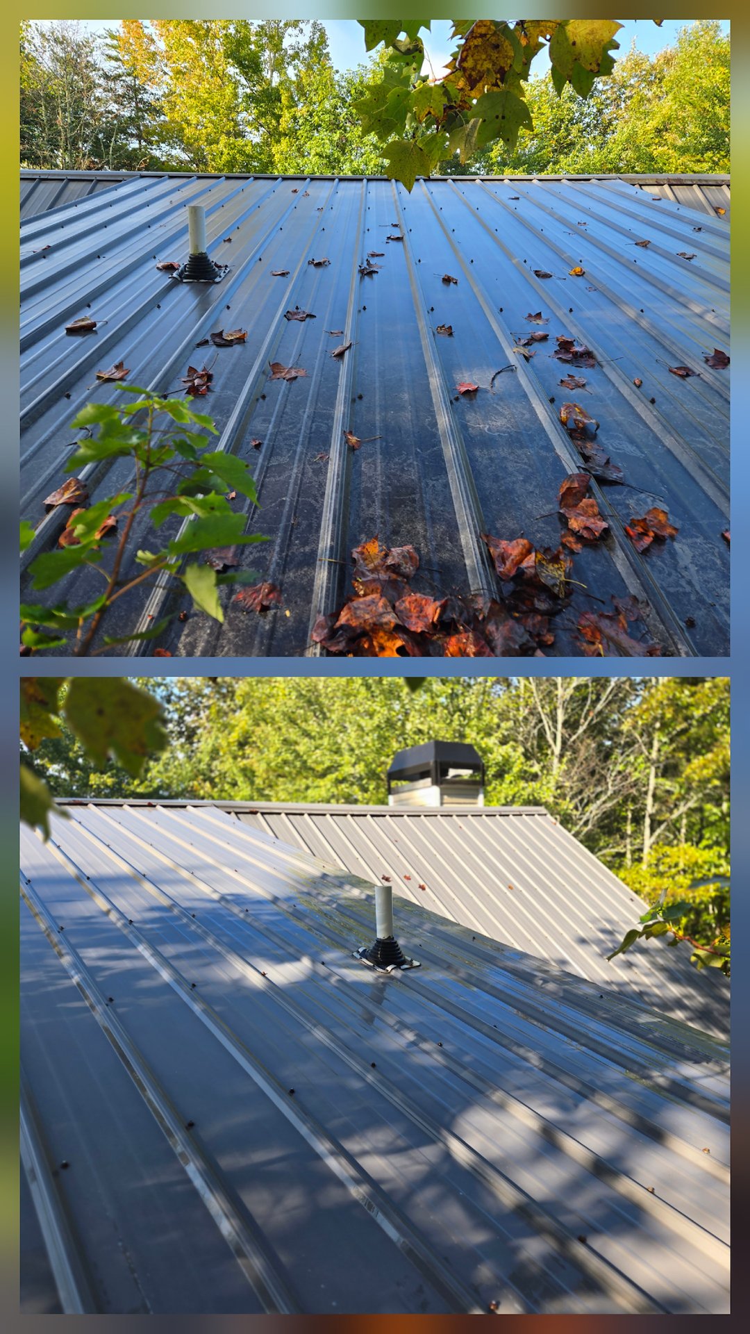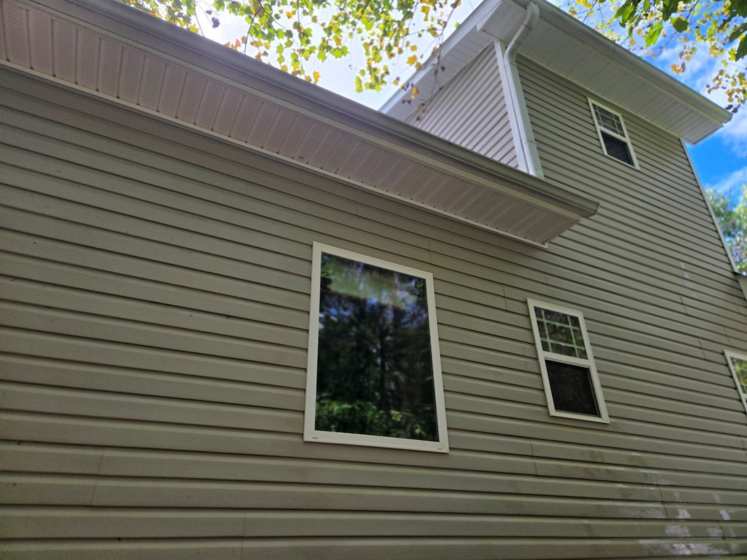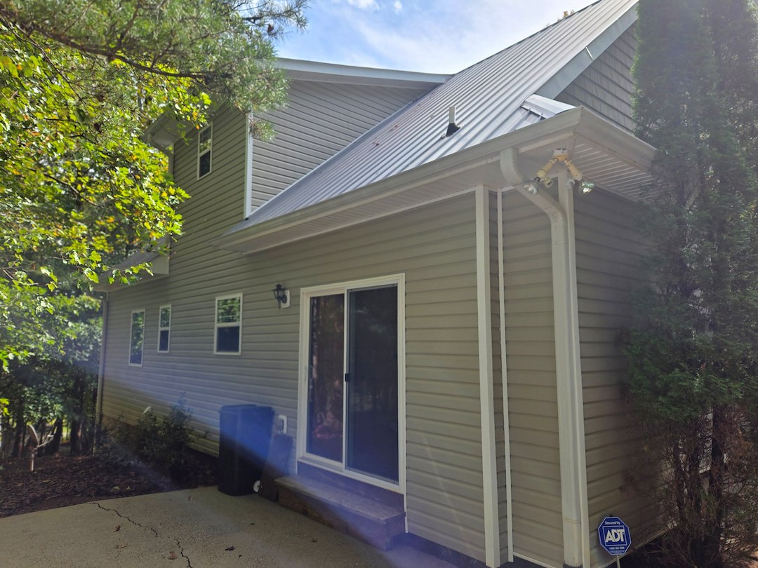The metal roof was soft washed both from a ladder and the ground. Once the roof was cleaned, I turned my attention to the siding, deck and gutters, ensuring a thorough wash to restore their original appearance. The homeowners let me know their house had never been this clean, and they were excited to spend time with their family and friends in their revitalized home.